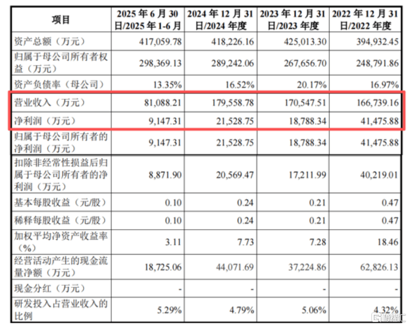 2022年、2023年、2024年和2025年1-6月(报告期),公司营业收入分别为16.67亿元、17.05亿元、17.96亿元和8.11亿元,归属于母公司所有者的净利润分别为4.15亿元、1.88亿元、2.15亿元和9147.31万元,2023年净利润大幅下滑。