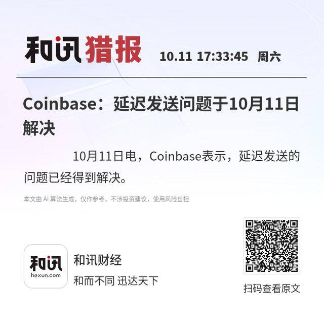 10月11日电,Coinbase表示,延迟发送的问题已经得到解决。