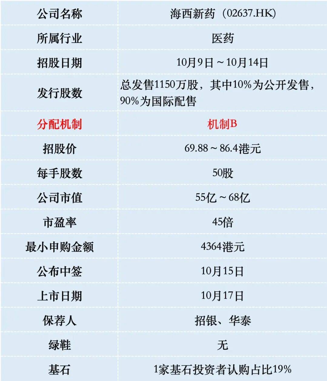 海西新药此次IPO发行股份占全部股份比例的14.6%,按招股价上限86.4港元算,募资9.94亿,1名基石投资者锁定1.71亿,剩余流通盘8.23亿,这个盘子很大。