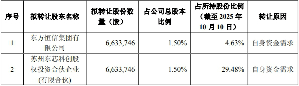 中国经济网北京10月13日讯 东芯股份(688110.SH)10月10日晚间发布股东询价转让计划书。本次询价转让的出让方东方恒信集团有限公司、苏州东芯科创股权投资合伙企业(有限合伙)为公司控股股东及其一致行动人。东方恒信集团有限公司、苏州东芯科创股权投资合伙企业(有限合伙)持有东芯股份股份比例超过5%。