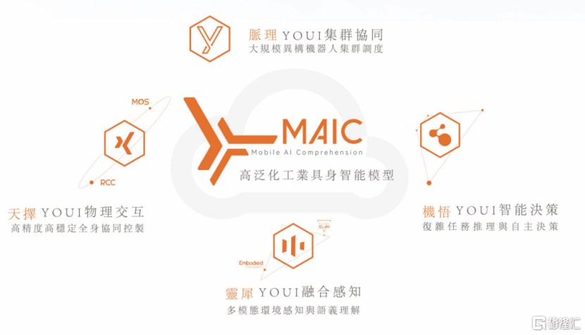 所谓“一脑”,指的是公司自主研发的高泛化工业具身智能模型“MAIC”。依托着MAIC模型,公司通过“灵犀—机悟—天择—脉理”四大模块,实现感知融合、任务决策、物理交互和集群协同等功能。这如同AI大脑的系统,使机器人能够在复杂、动态的工业环境中实现高精度、高可靠性的任务执行。