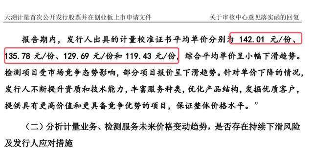 报告期内,天溯计量出具的计量校准证书平均单价分别为142.01元/份、135.78元/份、129.69元/份和119.43元/份,综合平均单价呈小幅下滑趋势。检测项目受市场竞争态势影响,部分项目报价呈下滑趋势。