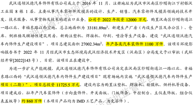 武汉内饰件项目(二期)环境影响报告表显示,一期项目年产各类汽车内饰件1,100万件,二期项目年产汽车装饰件约860万件,整体产能合计约为1,960万件/年。该产能合计数据远高于招股书中披露的该项目“达成年产1,219.00万件汽车内饰件”的产能数据。