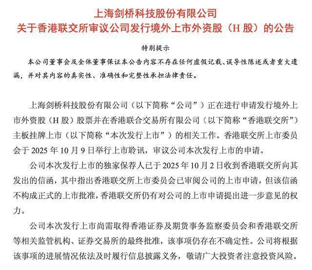 瑞财经 吴文婷10月10日,剑桥科技发布公告称,公司正在进行申请发行境外上市外资股(H股)股票并在香港联合交易所有限公司主板挂牌上市的相关工作。香港联交所上市委员会于2025年10月9日举行上市聆讯,审议公司本次发行上市的申请。