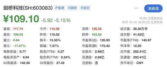 截至发稿时,剑桥科技A股报109.1元,跌5.15%,总市值约292.41亿元。自年初至今,其股价累计上涨170.08%。