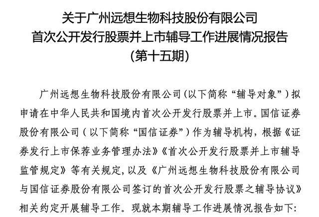瑞财经 吴文婷 近日,广州远想生物科技股份有限公司(以下简称“远想生物”)披露IPO辅导工作进展情况报告(第十五期),辅导机构为国信证券股份有限公司(以下简称“国信证券”) 。