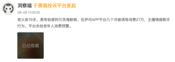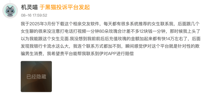 例如,用户“机灵喵”投诉称,其前后累计充值近14万元,却仍未成功获取对方联系方式;另一用户“洞察喵”则反映,家中80岁高龄、患有轻度阿尔茨海默症的老人,在几个月内被诱导消费高达27万元,期间平台未对老年人进行消费风险提示。