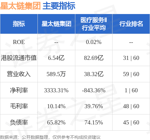 星太链集团港股市值6.54亿港元,在医疗服务Ⅱ行业中排名第31。主要指标见下表: