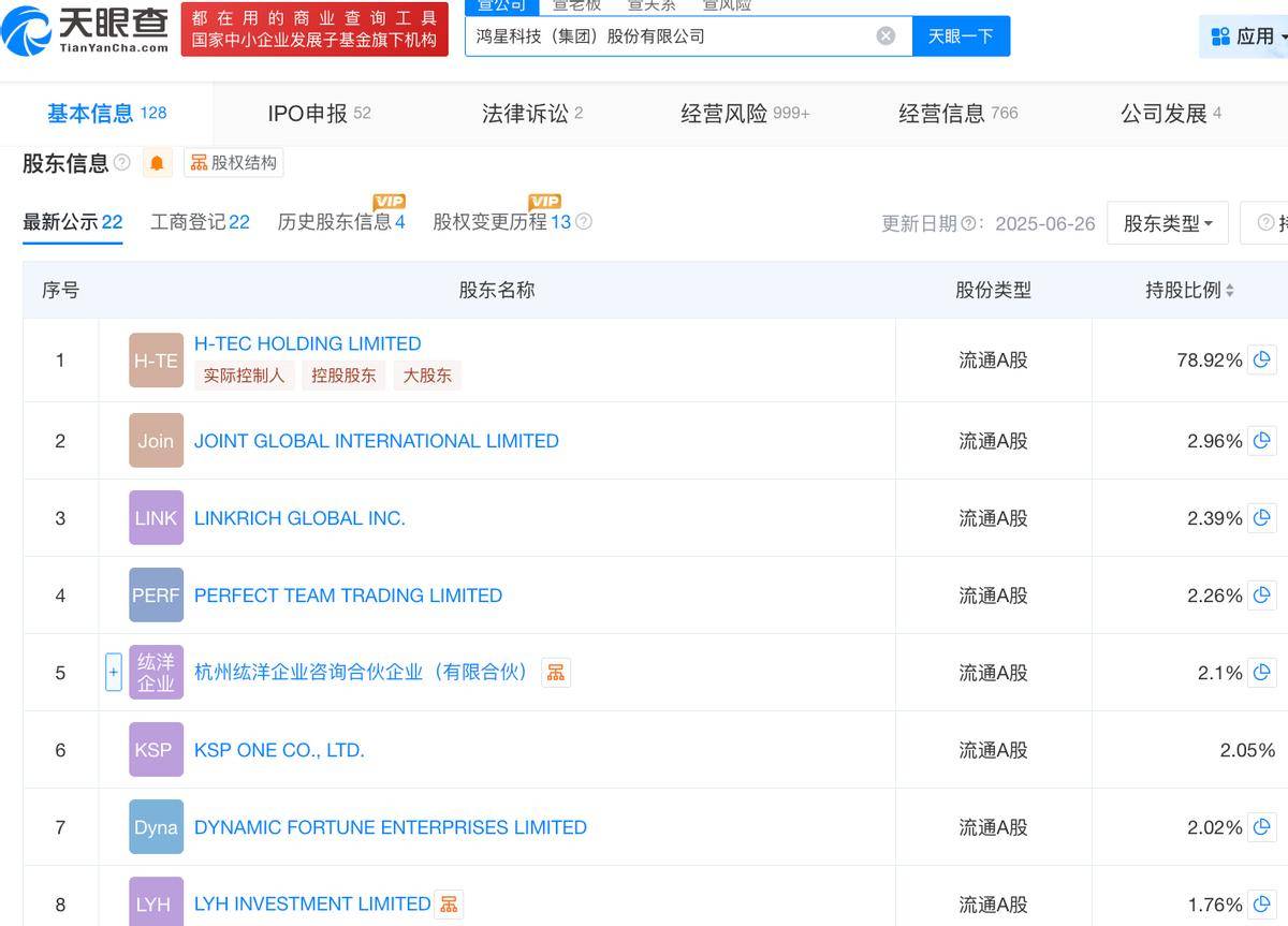 天眼查App信息显示,鸿星科技成立于1993年12月,前称为杭州鸿星电子有限公司。目前,该公司的注册资本约为1.48亿元,法定代表人为林洪河,主要股东包括H-TEC HOLDING LIMITED(下称“H-TEC”)等。