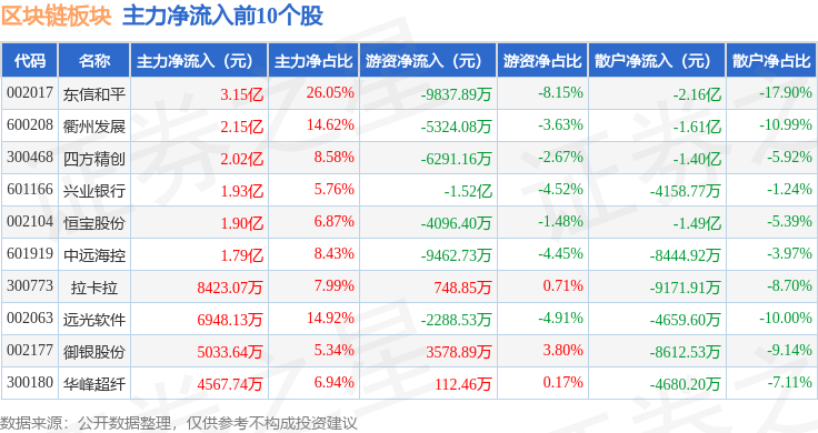 从资金流向上来看,当日区块链板块主力资金净流出67.97亿元,游资资金净流入20.88亿元,散户资金净流入47.09亿元。区块链板块个股资金流向见下表: