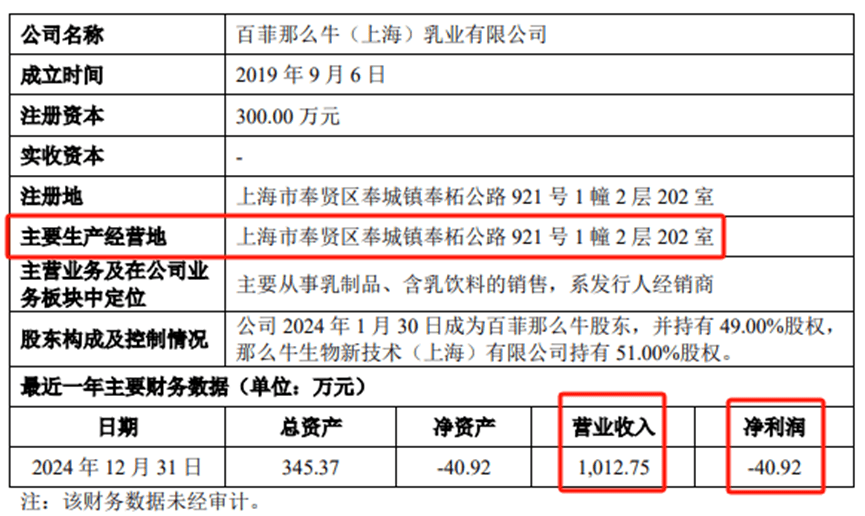 IPO申报稿显示,百菲那么牛系百菲乳业经销商,其主要从事乳制品、含乳饮料的销售,注册地和主要生产经营地均为“上海市奉贤区奉城镇奉柘公路921号1幢2层202室”。