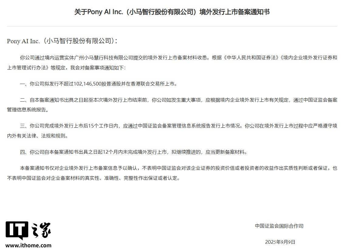 IT之家 10 月 14 日消息,中国证监会今日发布了《关于 Pony AI Inc.(小马智行股份有限公司)境外发行上市备案通知书》。公告显示,小马智行拟发行不超过 102,146,500 股普通股并在香港联合交易所上市。
