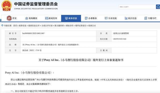 同一日,Pony AI Inc.(小马智行股份有限公司)港股IPO获备案通知书,公司拟发行不超过102,146,500股普通股并在香港联合交易所上市。