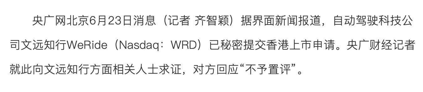 今年7月,市场传出重磅消息,文远知行已秘密向香港联合交易所提交上市申请,开启二次上市新征程。彼时,文远知行方面对此回应:“不予置评”。