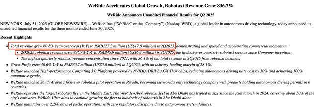 业绩方面,今年二季度,文远知行实现营收为1.27亿元,同比增长60.8%;其中,Robotaxi业务营收为4590万元,同比增长836.7%,Robotaxi业务占二季度营收比例提升至36.1%。