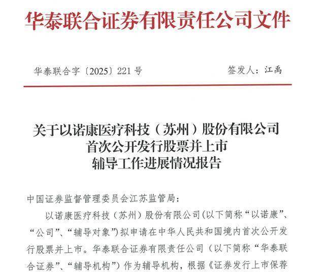 瑞财经 刘治颖 近日,以诺康医疗科技(苏州)股份有限公司(以下简称:以诺康)披露关于首次公开发行股票并上市辅导工作进展情况报告,华泰联合证券为辅导机构。