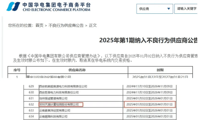 何以此言?究其原因在于该公司今年1月被大型央企华电集团拉黑,被纳入“不良行为供应商”,取消其一年交易资格。(见下图,本图选自互联网)。中国华电集团作为央企客户,将天溯计量列为不良供应商,这意味着天溯计量在合作中存在严重违规行为。