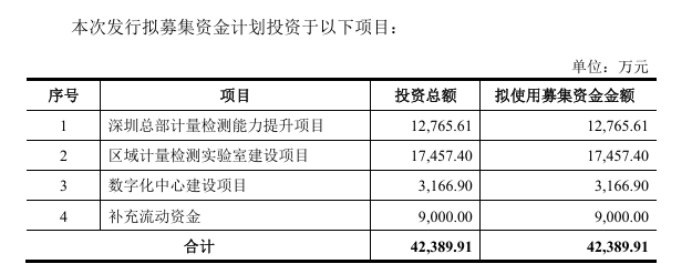 此外,该公司募资补流的必要性也令人质疑。招股书显示,天溯计量本次拟募集资金4.24亿元,将用于深圳总部计量检测能力提升项目、区域计量检测实验室建设项目、数字化中心建设项目、补充流动资金,使用募集资金分别为1.28亿元、1.75亿元、3166.90万元、9000万元。