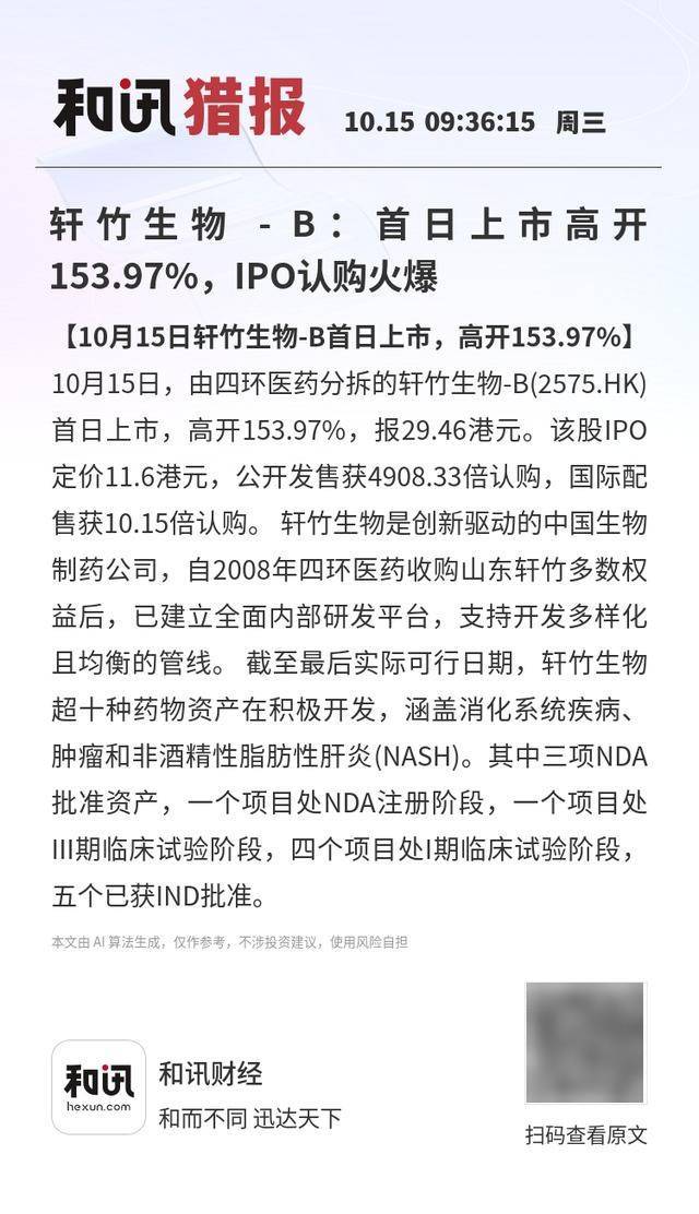 【10月15日轩竹生物-B首日上市,高开153.97%】10月15日,由四环医药分拆的轩竹生物-B(2575.HK)首日上市,高开153.97%,报29.46港元。该股IPO定价11.6港元,公开发售获4908.33倍认购,国际配售获10.15倍认购。 轩竹生物是创新驱动的中国生物制药公司,自2008年四环医药收购山东轩竹多数权益后,已建立全面内部研发平台,支持开发多样化且均衡的管线。 截至最后实际可行日期,轩竹生物超十种药物资产在积极开发,涵盖消化系统疾病、肿瘤和非酒精性脂肪性肝炎(NASH)。其中三项NDA批准资产,一个项目处NDA注册阶段,一个项目处III期临床试验阶段,四个项目处I期临床试验阶段,五个已获IND批准。