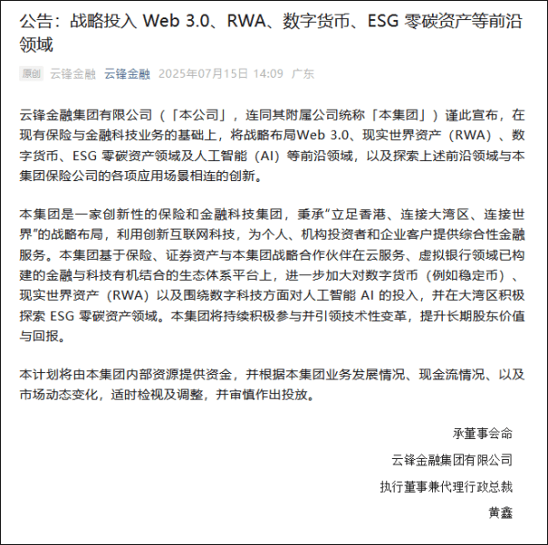 今年7月15日,停更接近3年的云锋金融官方公众号宣布,在现有保险与金融科技业务的基础上,将战略布局Web 3.0(第三代互联网)、现实世界资产(RWA)、数字货币、ESG(环境、社会和公司治理)零碳资产领域及人工智能(AI)等前沿领域,以及探索上述前沿领域与集团保险公司的各项应用场景相连的创新。
