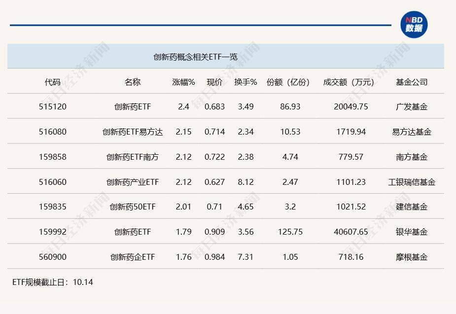 点评:创新药ETF(515120)今日上午涨幅达到2.4%,其份额为86.93亿份,半日成交金额为2亿元,该ETF追踪的是中证创新药产业指数,追踪该指数的ETF还包括创新药ETF易方达(516080)、创新药企ETF(560900)、创新药产业ETF(516060)等。其中,创新药ETF(159992)半日涨幅为1.79%,该ETF规模较大,其份额达到125.75亿份,其半日成交金额为4.06亿元,