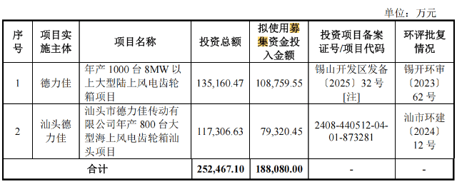 招股书显示,此次IPO,德力佳计划募集资金18.8亿元,其中10.9亿元用于年产1000台8MW以上大型陆上风电齿轮箱项目,0.79亿元用于汕头市德力佳传动有限公司年产800台大型海上风电齿轮箱汕头项目。