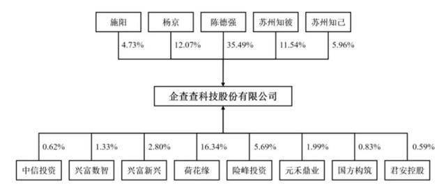 据招股书披露,陈德强为企查查控股股东、实际控制人,其直接持股35.49%,通过苏州知彼间接控制11.54%的股份,通过苏州知己间接控制5.96%的股份,合计控制企查查53.00%的股份。