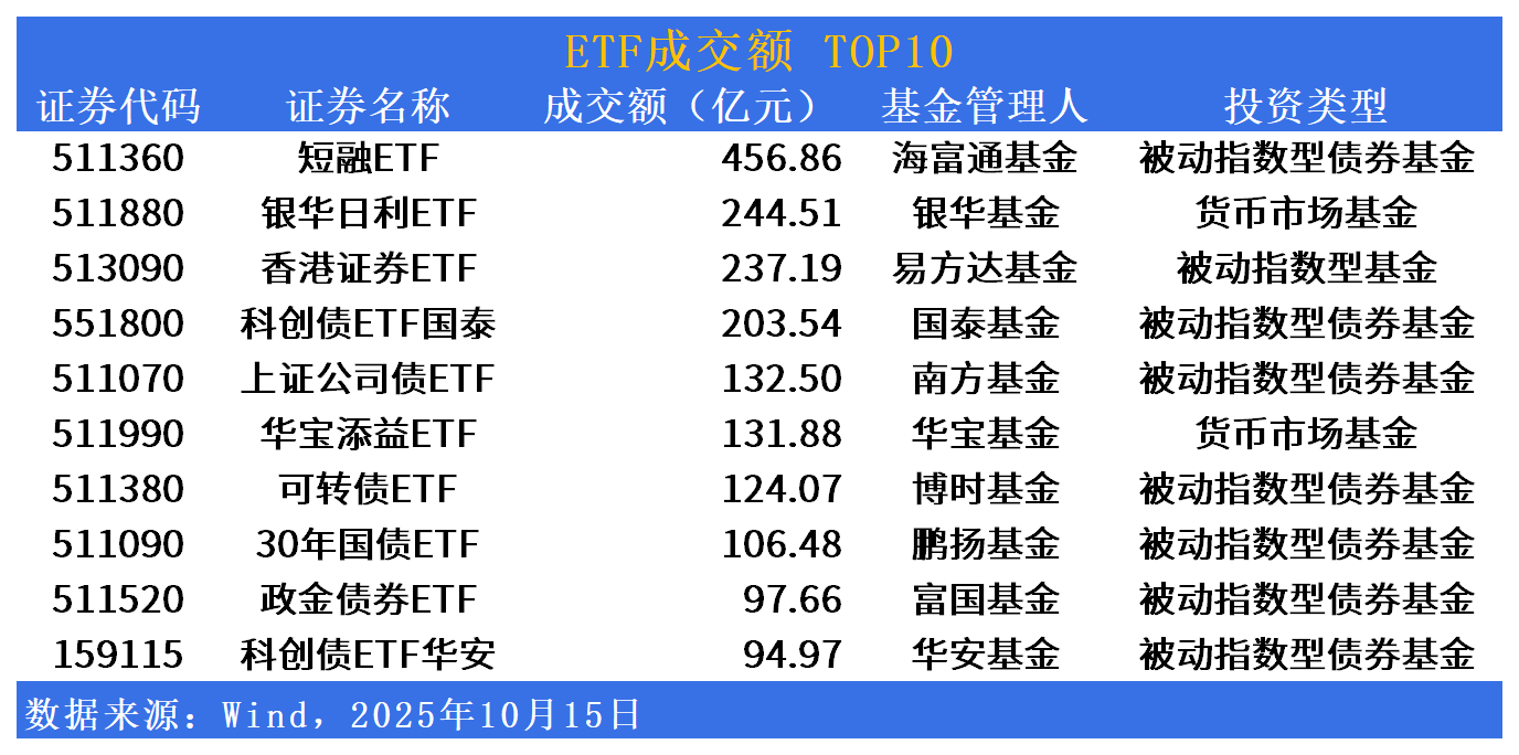 成交额方面,短融ETF(511360)今日成交额居首,达456亿元;银华日利ETF(511880)、香港证券ETF(513090)、科创债ETF国泰(551800)成交额紧随其后。