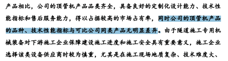 一轮回复中,唐兴科技称,公司顶管机产品的品种、技术性能指标与可比公司同类产品无明显差异;盾构机和TBM产品的技术性能指标与可比公司同类产品无明显差异。