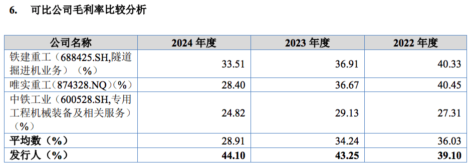 也就是说,2022年时,唐兴科技毛利率还与2家可比公司相近,但到2024年时较3家可比公司均明显较高,比中铁工业高19个百分点,比铁建重工高11个百分点。