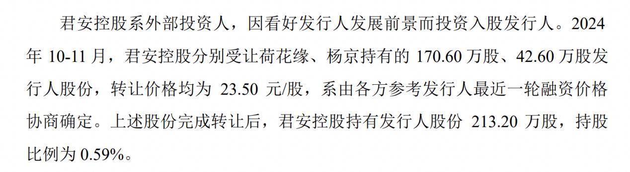 据披露,君安控股系外部投资人,因看好企查查发展前景而投资入股企查查。2024年10-11月,君安控股分别受让荷花缘、杨京持有的170.60万股、42.60万股企查查股份,转让价格均为23.50元/股,系由各方参考企查查最近一轮融资价格协商确定。据此,荷花缘、杨京分别套现4009.1万元、1001.1万元。