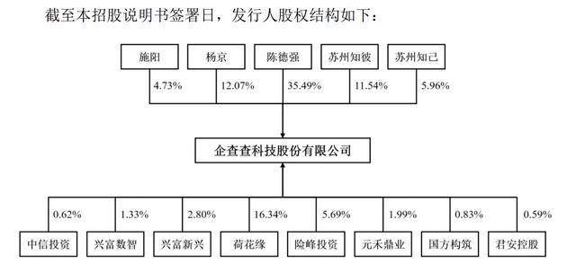 截至本招股说明书签署日,企查查控股股东、实际控制人为陈德强。陈德强直接持有公司35.49%的股份,通过苏州知彼间接控制公司11.54%的股份,通过苏州知已间接控制公司5.96%的股份,合计控制公司53%的股份,系公司控股股东、实际控制人。