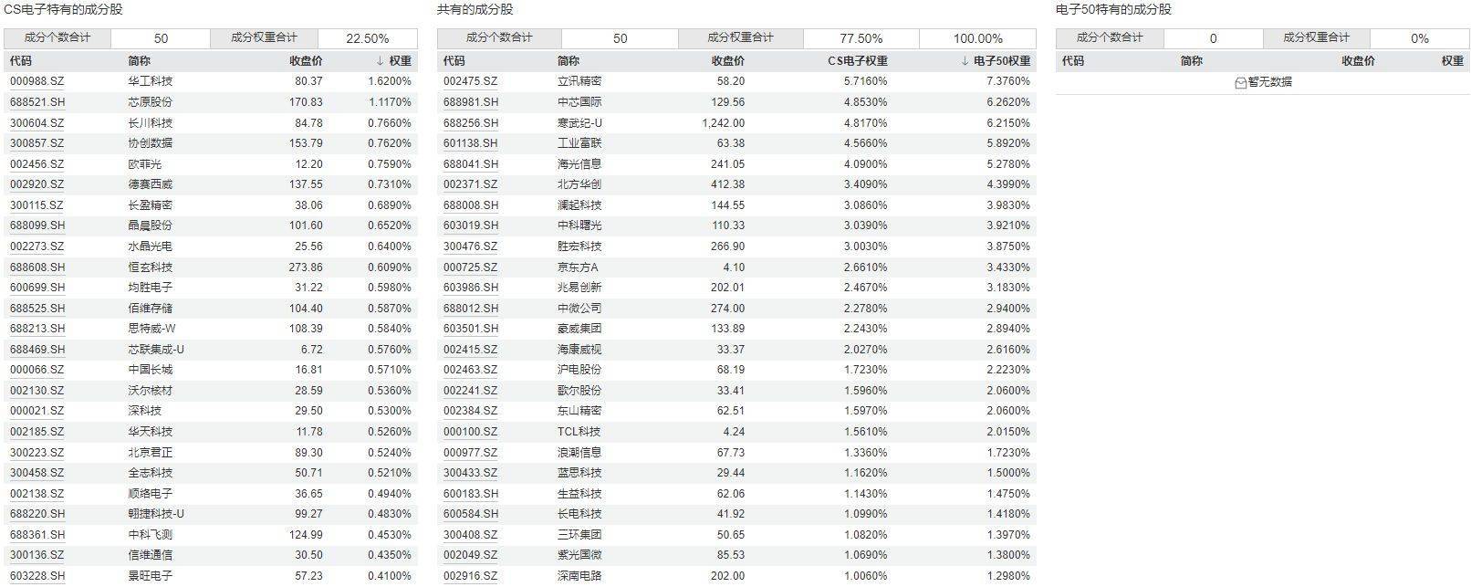 进一步对比两个指数的成分股,可以看到两个指数共有的成分股是50只,也就是说,中证电子指数的100只成分股完全覆盖了中证电子50指数的50只成分股,同时还比中证电子50指数多了50只成分股。