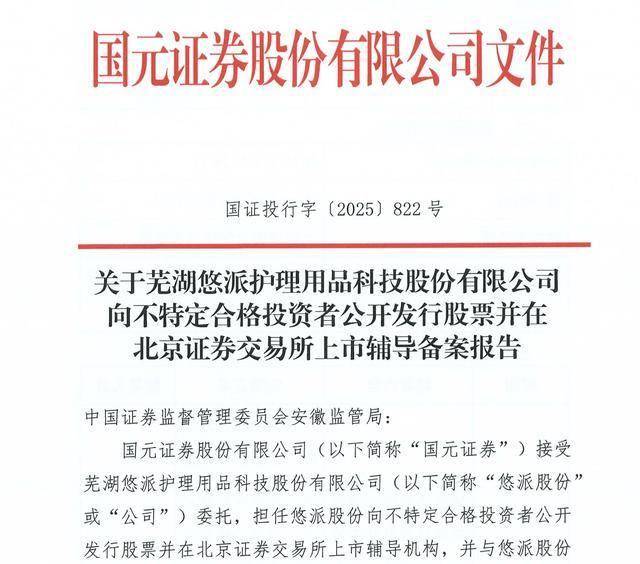 瑞财经 刘治颖 10月13日,芜湖悠派护理用品科技股份有限公司(以下简称:悠派股份)在安徽证监局完成IPO辅导备案,拟北交所上市,辅导机构为国元证券。