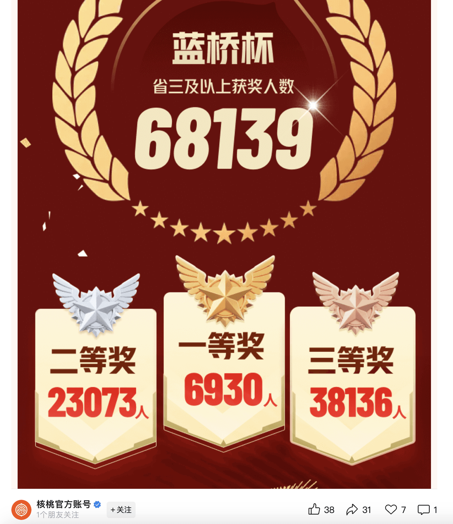 虽然截至今年9月,“蓝桥杯”已经被移出白名单,但在10月13日的公告中,核桃编程仍然把蓝桥杯奖项放在宣传界面最前排。在2025年第十六届蓝桥杯大赛中,核桃编程共计68139名学员在省赛及以上获奖,其中一等奖6930人;另外的ICC全球发明大会和AILD智能设计大赛获奖人数也近4万人。