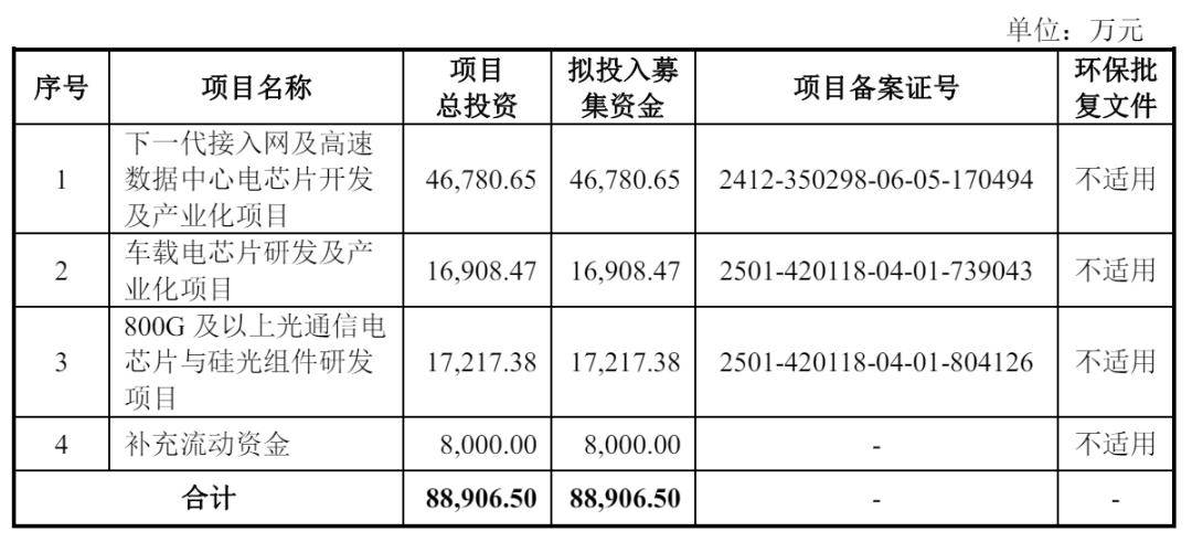 优迅股份计划募资8.89亿元,其中,4.68亿元用于下一代接入网及高速 数据中心电芯片开发 及产业化项目,1.69亿元用于车载电芯片研发及产业化项目,1.72亿元用于800G 及以上光通信电芯片与硅光组件研发项目,8000万元用于补充流动资金。