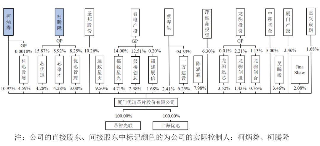 柯炳粦直接持有公司10.92%股份,通过担任科迅发展的执行事务合伙人间接控制公司4.59%表决权,共控制公司15.51%表决权;柯腾隆担任员工持股平台芯优迅、芯聚才、优迅管理的执行事务合伙人,并通过上述三个员工持股平台控制公司11.63%表决权。