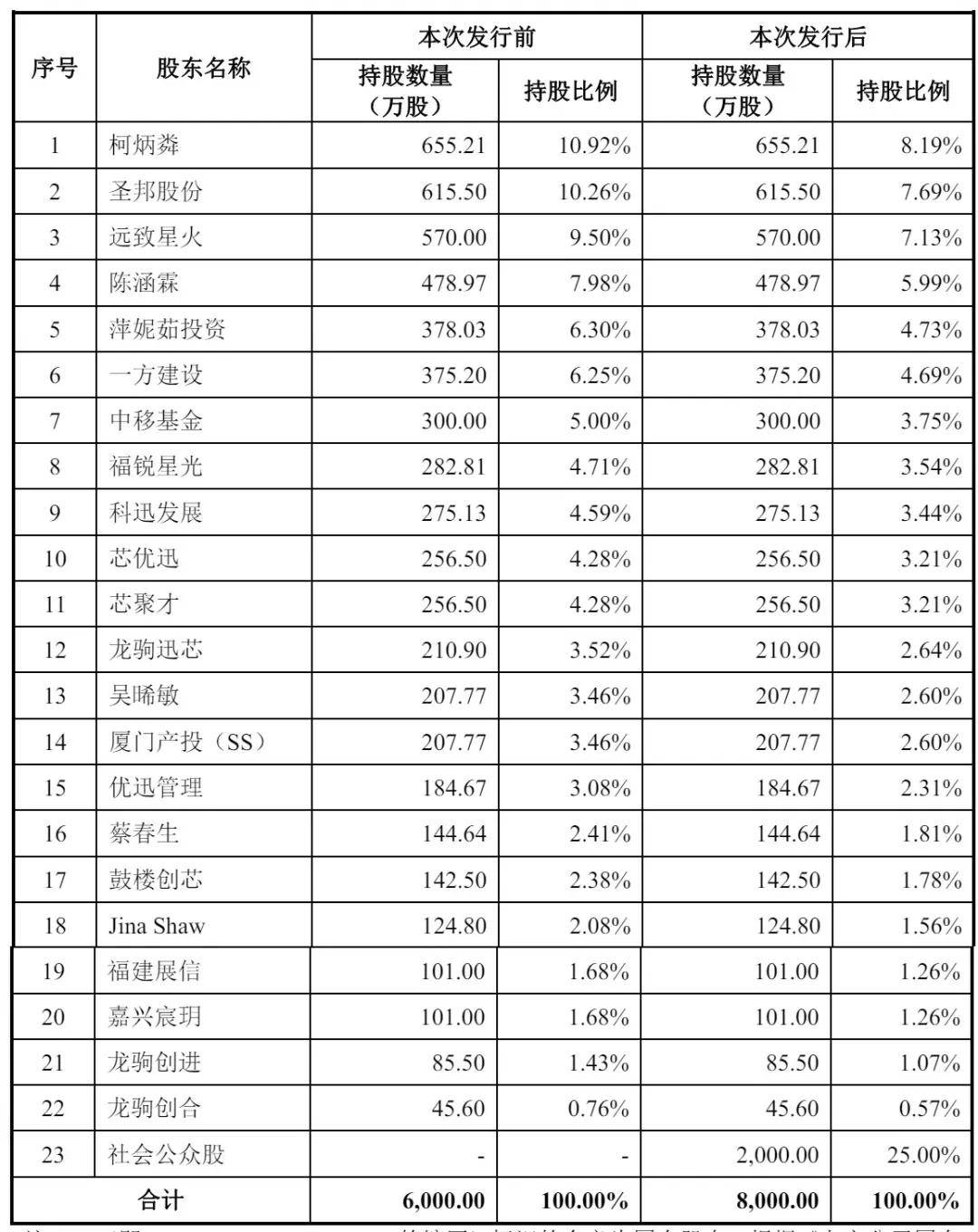 IPO后,柯炳粦持股为8.19%,圣邦股份持股为7.69%,远致星火持股为7.13%,陈涵霖持股为5.99%,萍妮茹投资持股为4.73%,一方建设持股为4.69%,中移基金持股为3.75%,福锐星光持股为3.54%,科迅发展持股为3.44%,芯优迅、芯聚才分别持股为3.21%;