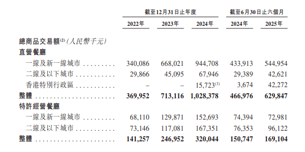 以总商品交易额来看,2022年实现5.11亿元,2023年为9.60亿元,2024年为13.48亿元,2025年上半年达7.99亿元。在2024年中国前十大中式面馆经营者中,遇见小面2022年至2024年的总商品交易额年复合增长率最高。