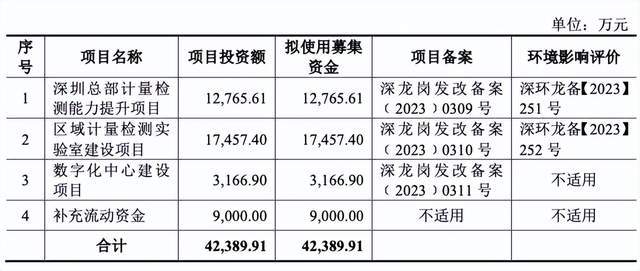 根据《招股书》,天溯计量本次拟募资约4.24亿元。资金将主要投向四个方面,1.28亿元用于“深圳总部计量检测能力提升项目”,1.75亿元用于“区域计量检测实验室建设项目”,约3167万元用于“数字化中心建设项目”,以及9000万元用于“补充流动资金”。
