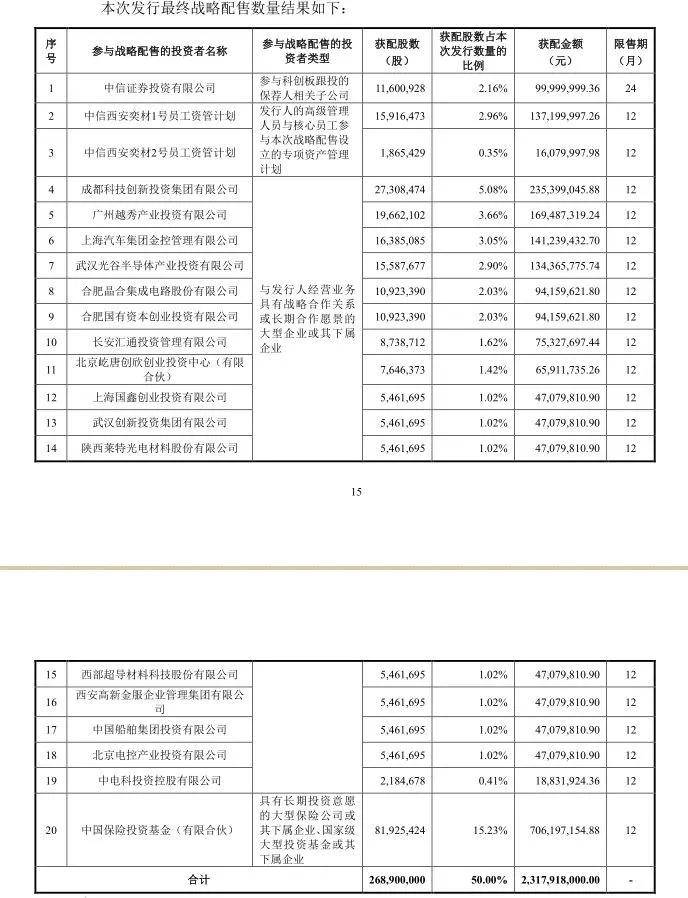 中信证券的直投公司——中信证券投资公司斥资1亿元拿下1160.09万股;中信西安奕材1号员工资管计划和中信西安奕材2号员工资管计划合计斥资1.53亿元拿下1778.19万股。这显示出,券商直投和高管及核心员工在积极参与战略配售。