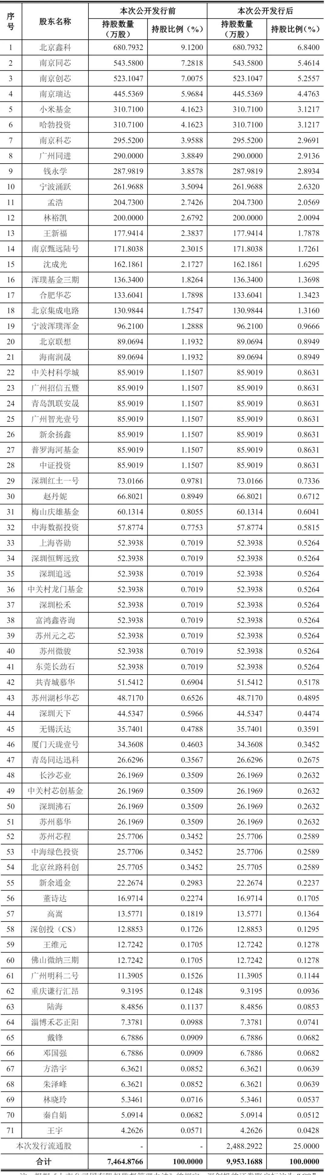IPO后,北京鑫科持股为6.84%,南京同芯持股为5.4614%,南京创芯持股为5.2557%,南京瑞达持股为4.4763%,小米基金、华为旗下哈勃投资分别持股为3.1217%,南京科芯持股为2.9691%,广州同进持股为2.9136%,钱永学持股2.8934%,宁波涌跃持股为2.632%,孟浩持股为2.0569%,林裕凯持股为2.0094%;