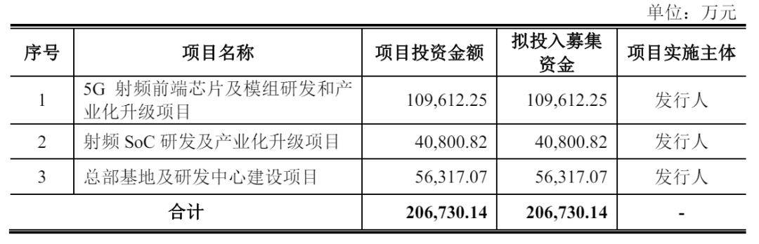 昂瑞微计划募资20.67亿,其中,11亿元用于5G射频前端芯片及模组研发和产业化升级项目;4.08亿元用于射频SoC研发及产业化升级项目,5.63亿元用于总部基地及研发中心建设项目。