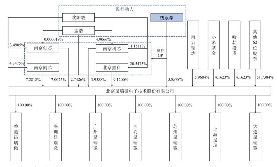 报告期内,昂瑞微实际控制人为钱永学。截至本招股说明书签署日,公司实际控制人钱永学直接持有昂瑞微3.8578%的股份,并通过特别表决权机制直接控制昂瑞微21.9494%的表决权;通过北京鑫科间接控制昂瑞微9.12%的股份,并通过特别表决权机制间接控制昂瑞微28.5387%的表决权;通过南京创芯、南京同芯、南京科芯间接控制昂瑞微10.3824%的表决权;同时通过一致行动关系间接控制昂瑞微1.5604%的表决权。