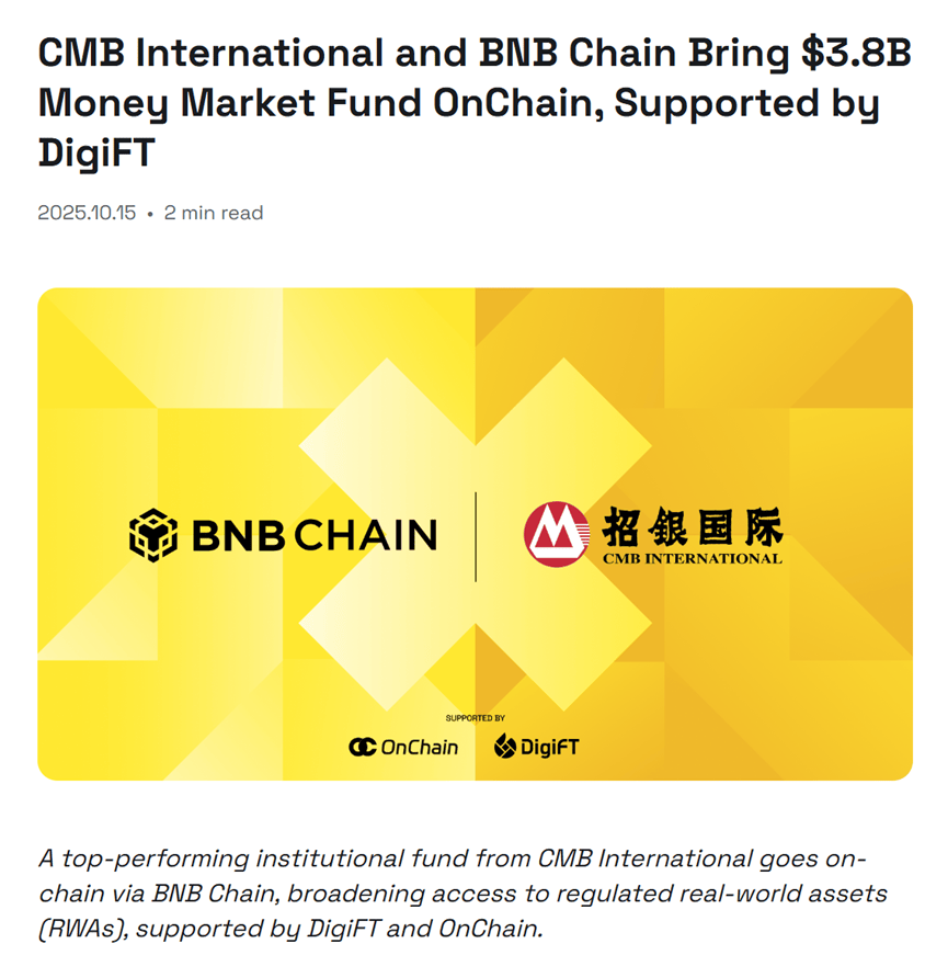 10月15日,招商银行(600036)全资子公司招银国际资产管理有限公司(CMBIAM)与BNB Chain达成合作,在DigiFT和OnChain的技术支持下,成功将旗下规模达38亿美元的美元货币市场基金通过代币化形式引入BNB Chain生态。该基金是亚太地区表现突出的货币市场基金之一,此次上链标志着机构级受监管现实世界资产(RWA)与主流区块链生态的深度融合,为合格投资者提供了更便捷的链上投资渠道。