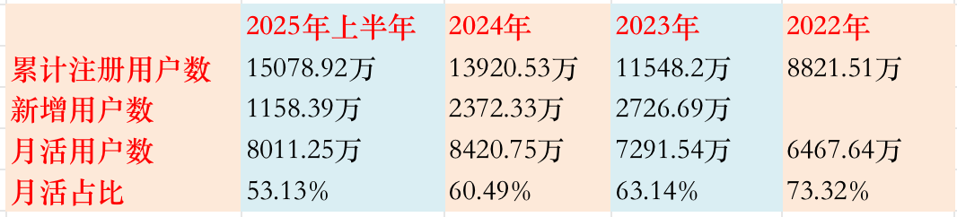 2022年至2025年上半年,公司累计注册用户数分别为8821.51万、11548.2万、13920.53万和15078.92万。经计算得出,2023年至2025年上半年企查查的新增用户分别为2726.69万、2372.33万、1158.39万。其中,2024年新增用户数较2023年减少了354.36万。因为2025年全年数据尚未公布,目前尚不能判定新增用户数下降已明确趋势。