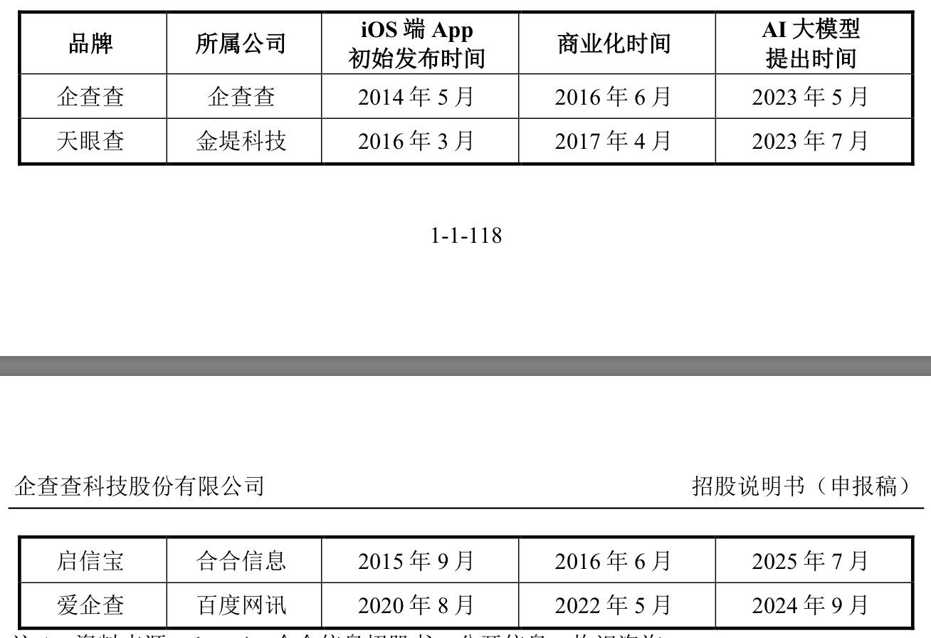 据了解,企查查目前在商业数据服务领域的竞争对手主要为天眼查、启信宝、爱企查等,这些竞争对手分别成立于2014年、2006年、2001年,上述品牌对应企业分别为金堤科技、合合信息(688615.SH)、百度网讯。参考灼识咨询和QuestMobile提供的数据,2023年,企查查市场份额、移动端活跃用户数排名第二,移动端应用商店下载量第一。