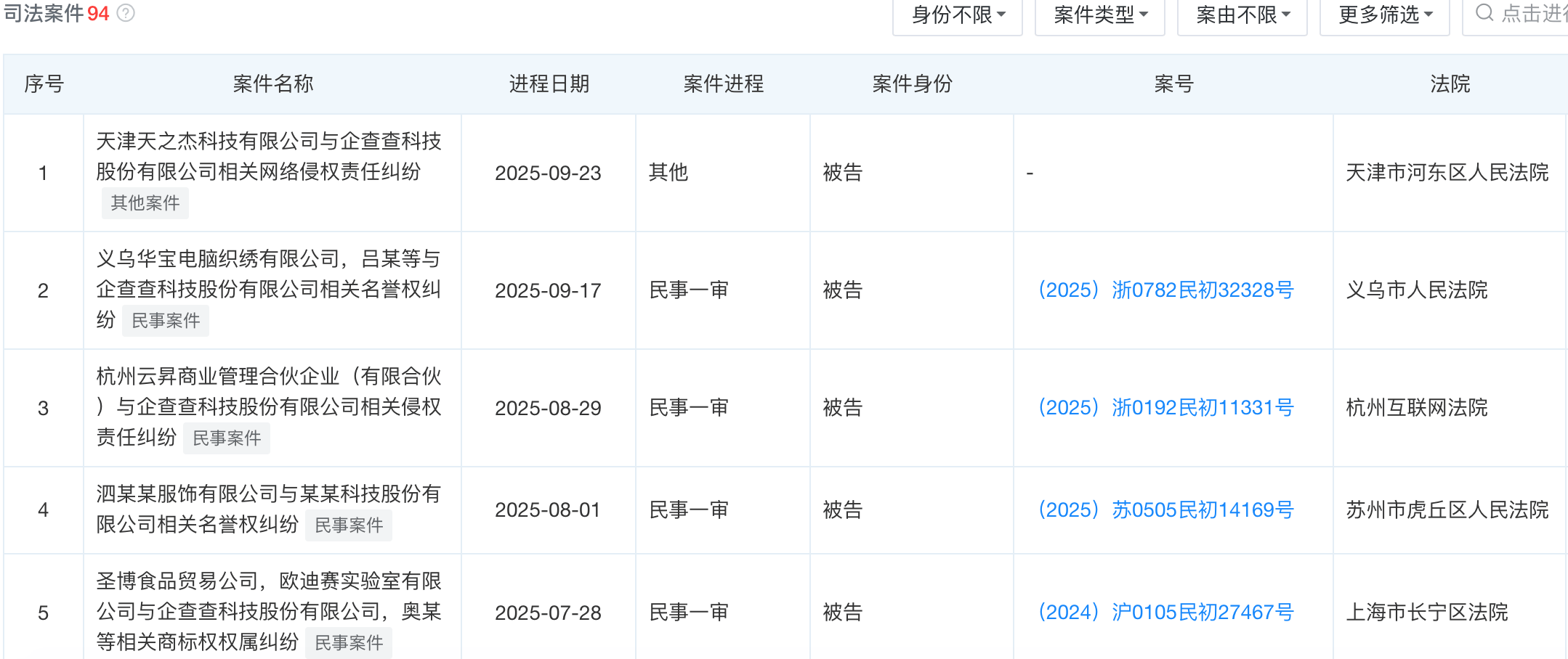 根据天眼查的数据统计,企查查涉及的司法案件记录共有94个,仅2025年以来就有24个。最近的一起是2025年9月23日,企查查与天津天之杰科技有限公司的网络侵权责任纠纷;同样在9月份,公司还与义乌华宝电脑织绣有限公司以及吕某等存在名誉权纠纷。