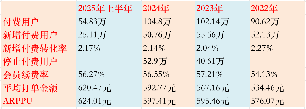 企查查会员的续费率各期分别为54.13%、57.21%、56.55%和56.27%,保持在相对稳定的水平。平均订单金额和ARPPU(付费用户平均收入,即付费金额/付费用户数)均保持增长态势,这两个指标在2025年上半年双双突破了600元大关。