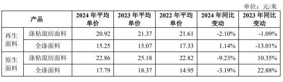 记者发现,这两种面料虽然收入均有所增长,但平均销售单价却均下滑。尤其是收入占比近七成的再生涤粘混纺面料,平均销售价格更是逐年下滑。据招股书,2022年—2024年,公司再生涤粘混纺面料平均销售价格分别为21.61元/米、21.37元/米和20.92元/米。